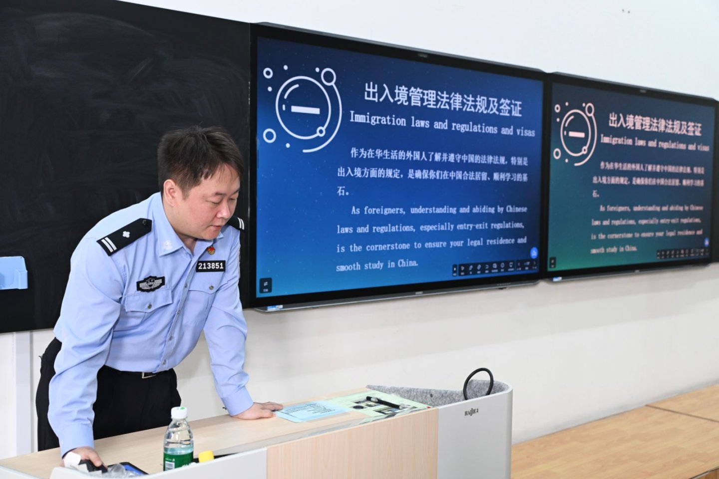 为帮助新生尽快适应在华学习和生活,学院还特别组织了安全教育培训及校规校纪宣讲会。会议特邀大连市出入境管理局、大连市交警支队旅顺口大队的警官,分别就出入境管理法律法规、电信诈骗、交通与人身安全、禁毒宣传以及防火安全教育进行宣讲。郭艳秋则围绕校园安全进行了主题教育。通过真实案例剖析,帮助学生们明晰在华学习应遵守的法律法规,了解交通安全注意事项,增强识毒、防毒、拒毒意识,提升消防安全能力,有效提升他们在日常生活中的安全防范能力,为校园生活与出行安全筑牢坚实屏障。随后,学院招生科与教学管理科分别就学院基本情况和教务管理规定作了详细介绍,帮助新生更好地规划学业,明确目标。